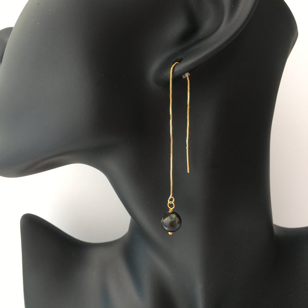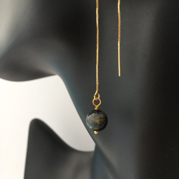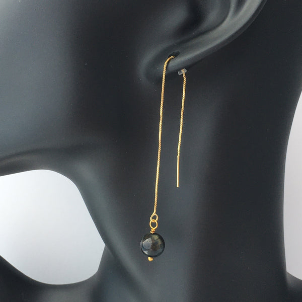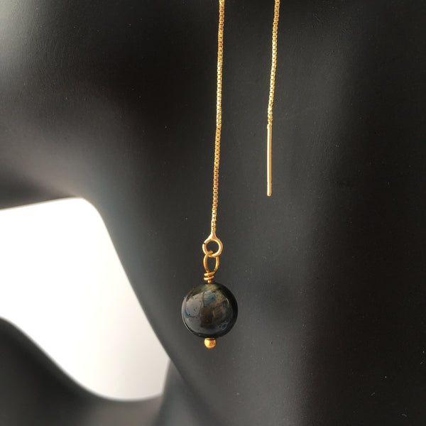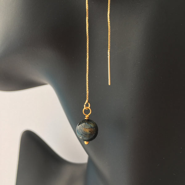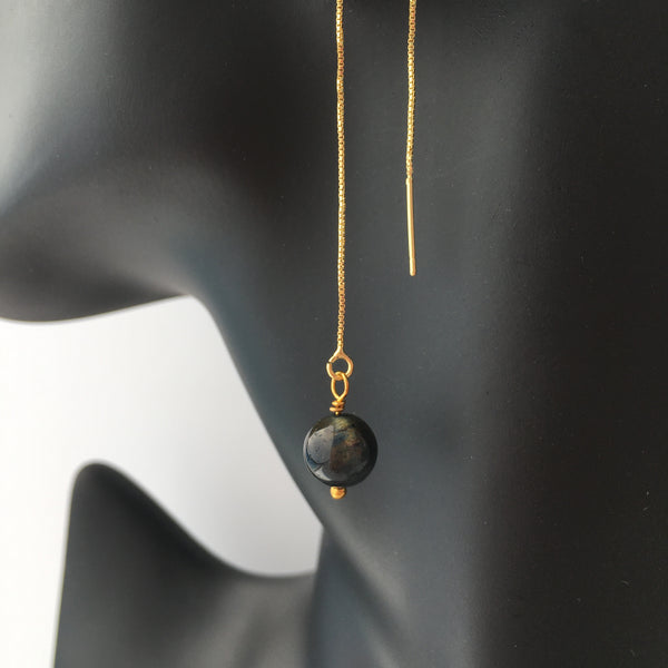 Genuine indigo tiger's eye gemstone threader earrings with gold plated long chain threader findings.