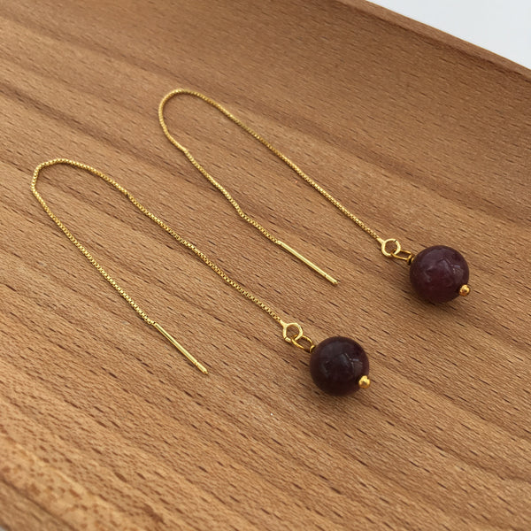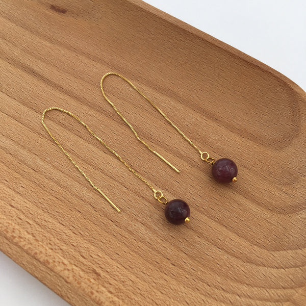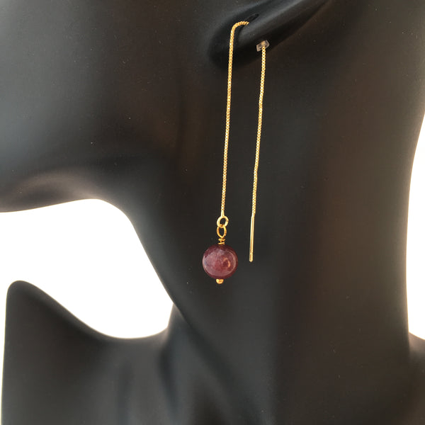Genuine natural Lepidolite gemstone threader earrings with gold plated long chain threader findings.