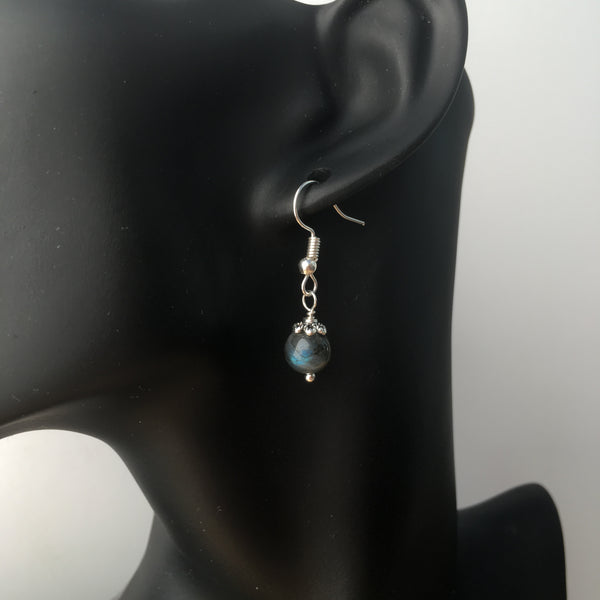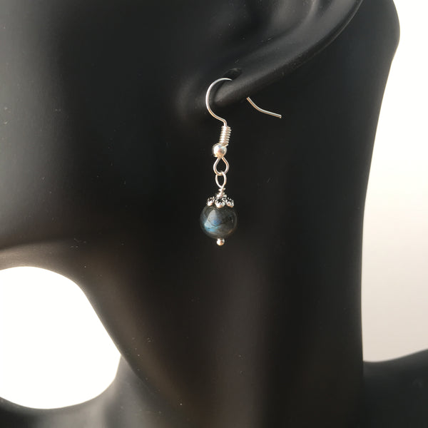 Genuine high quality blue flash Labradorite gemstone earrings with silver plated bead caps and findings.