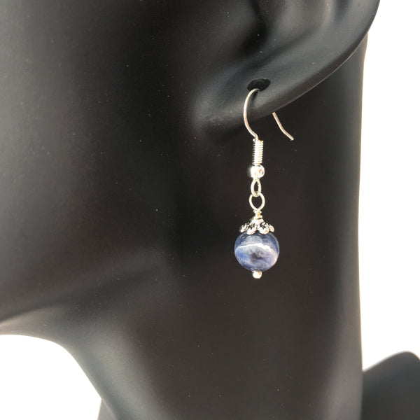Genuine Sodalite gemstone earrings with silver plated bead caps and findings.