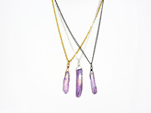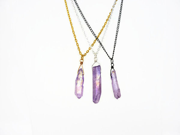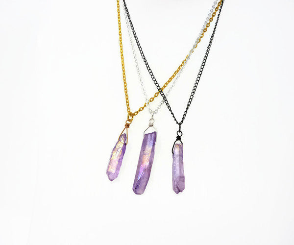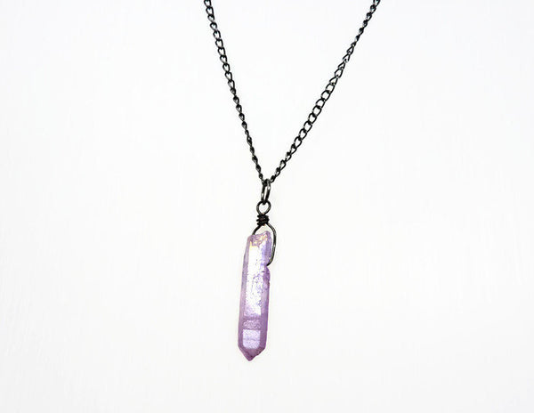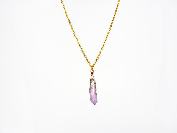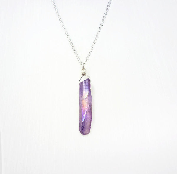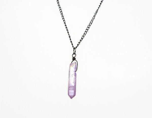 Gorgeous mystic lavender Aura quartz crystal pendant necklace. Slightly iridescent, with a golden rainbow hue when it catches the light.