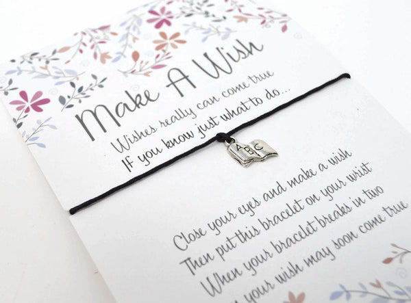 End of term/teacher's gift book wish bracelet, with ABC book charm. Available with a wide choice of cord colours.