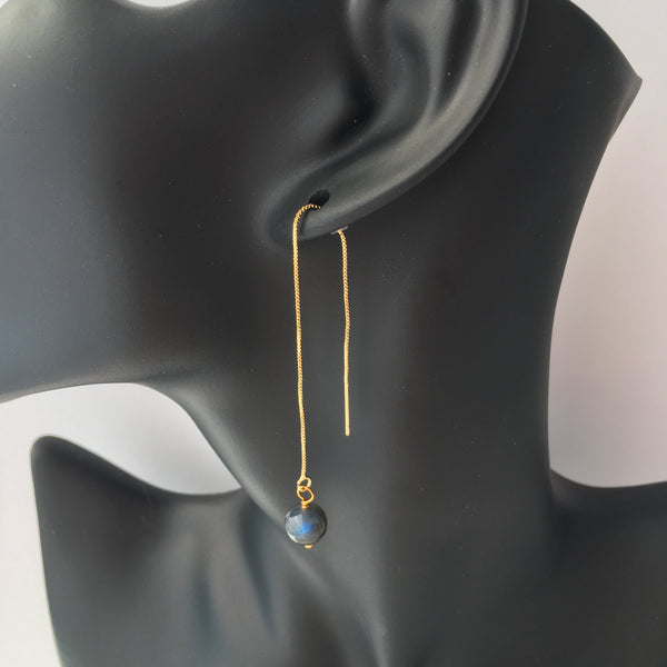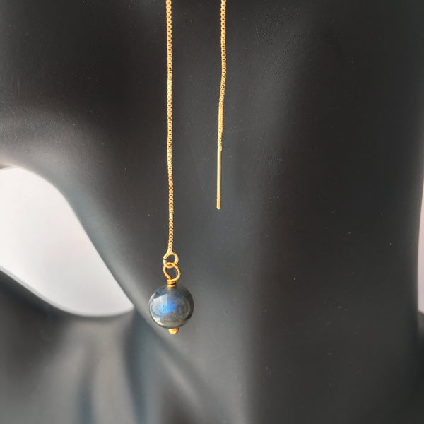 Genuine natural blue flash AAA Labradorite gemstone threader earrings with gold plated long chain threader findings.